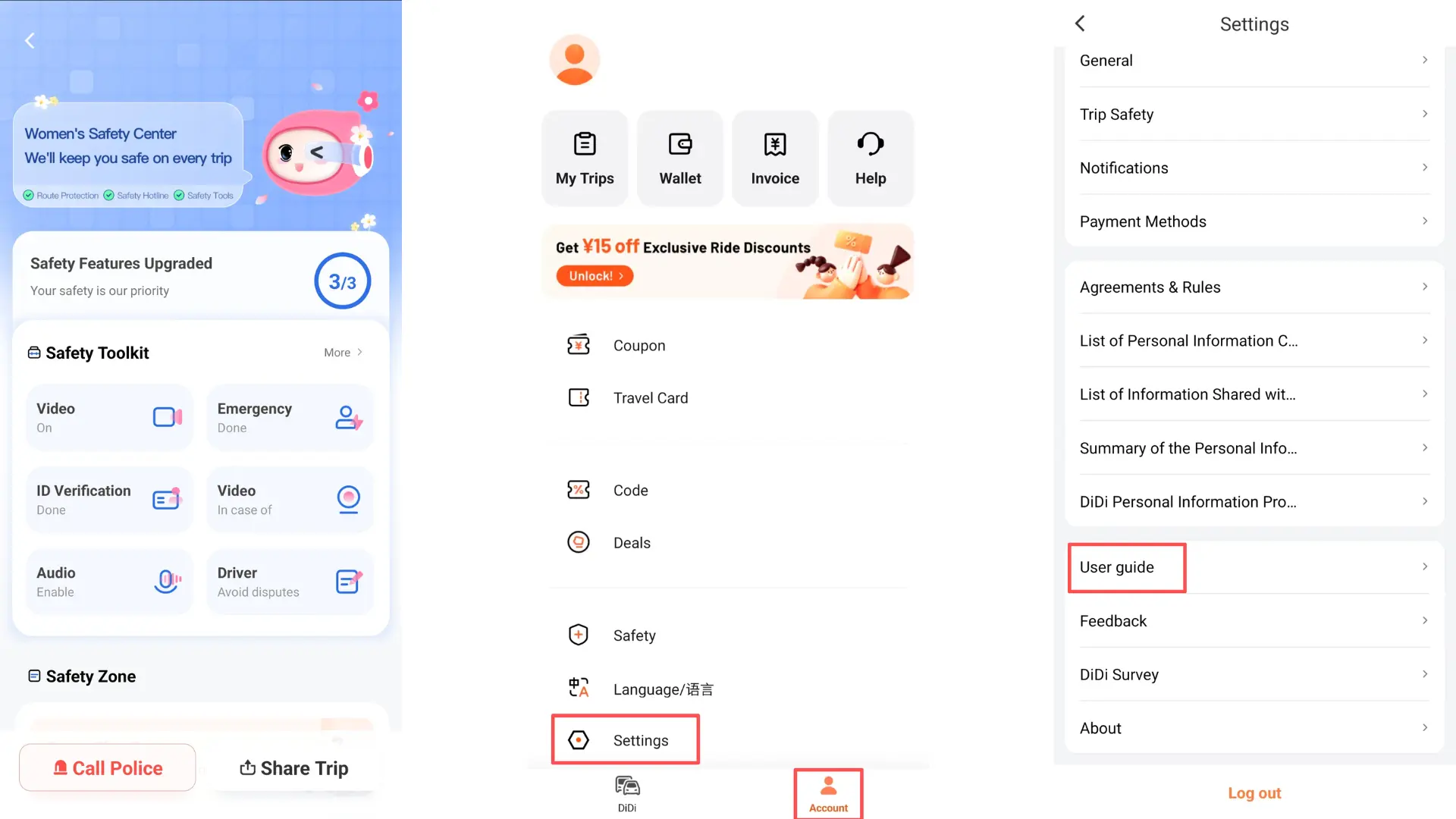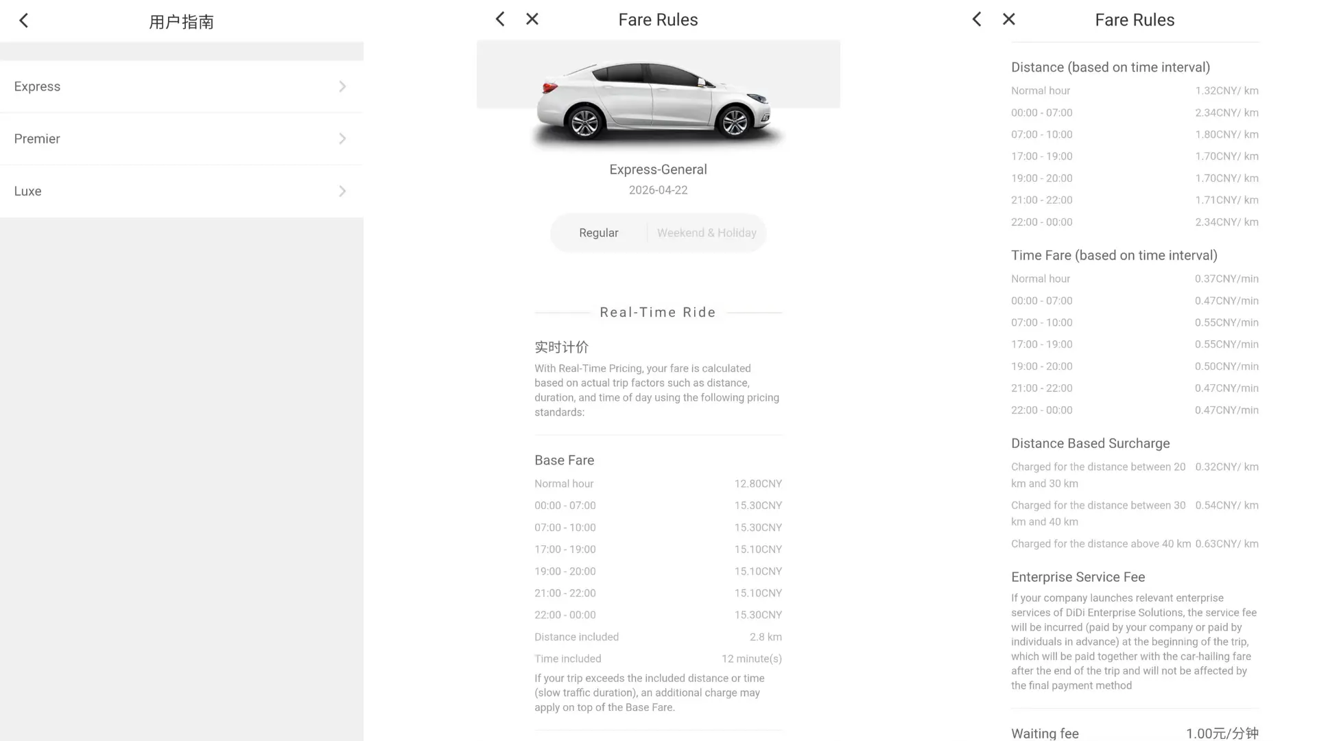 • Check fare rules: Go to Account → Settings → User Guide to view the starting fare and surcharge rules for different car types.